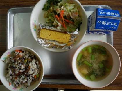 今日の給食の献立は ひじきごはん 牛乳 厚焼き卵 土佐漬け 小松菜とじゃがいものみそ汁 です。エネルギーは 621kcalです。