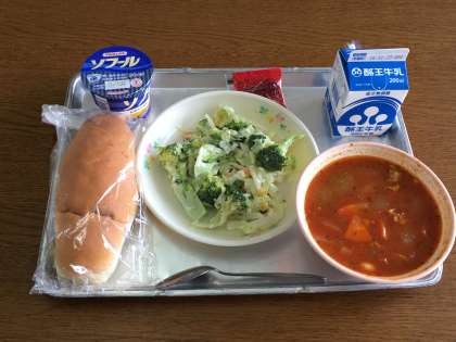 今日の給食の献立は 米粉パン 牛乳 いちごジャム 豚肉と大豆のケチャップ煮 ブロッコリーサラダ ヨーグルト です。エネルギーは 622kcalです。