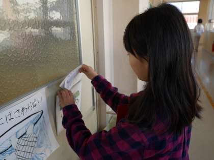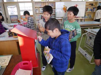 「読書ゆうびん」とは、本の紹介を読書ゆうびんのはがきに書き、友だちに送るものです。図書室にポストがあり、図書委員の子どもたちが各学級の郵便受けに配達します。