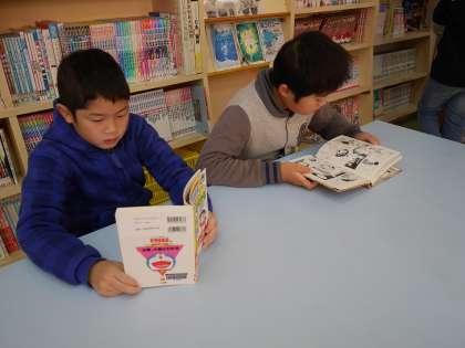 図書室で本を読んでいる子、桜花文庫にある「BOOKチョイス」の本の中から本を借りていいる子など、様々な方法で本に親しんでいる喜久田っ子です。
