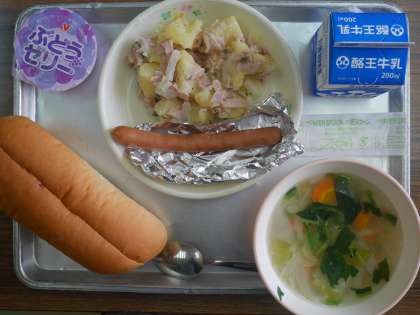 今日の給食の献立は ドッグパン 牛乳 野菜スープ ボイルドウィンナー ジャーマンポテト ぶどうゼリー です。エネルギーは 614kcalです。