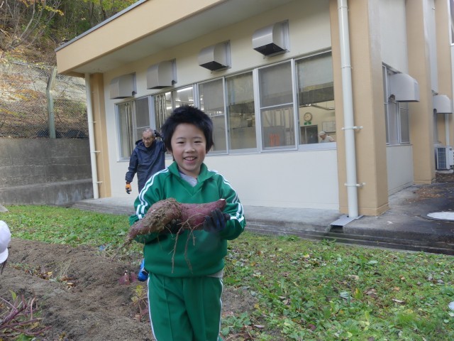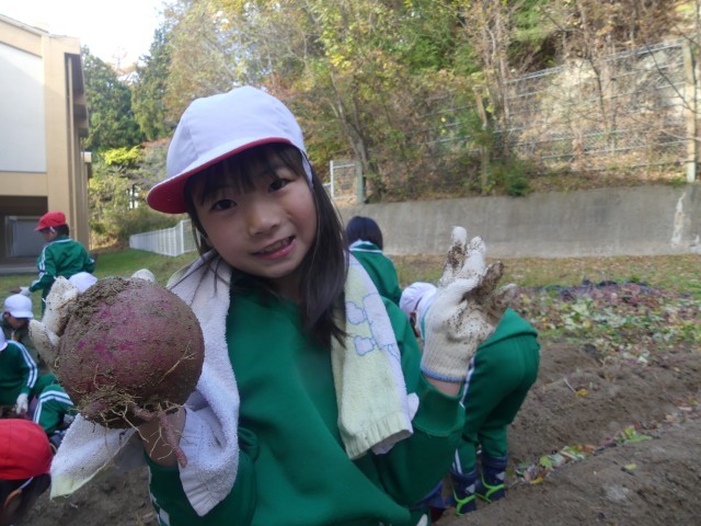 今日は1・2年合同で、夏の初めに植えたサツマイモを収穫しました。掘り始めると、ごろごろサツマイモが出てきます。大きなサツマイモ、丸いサツマイモ、いろいろな形のサツマイモが出てくるたび、秋色に色づいた熱海小学校の裏山に、子どもたちの大歓声が響きます。たくさん採れて大満足。ご指導くださった地域の方、手入れを手伝ってくださった用務員さん、ありがとうございました。