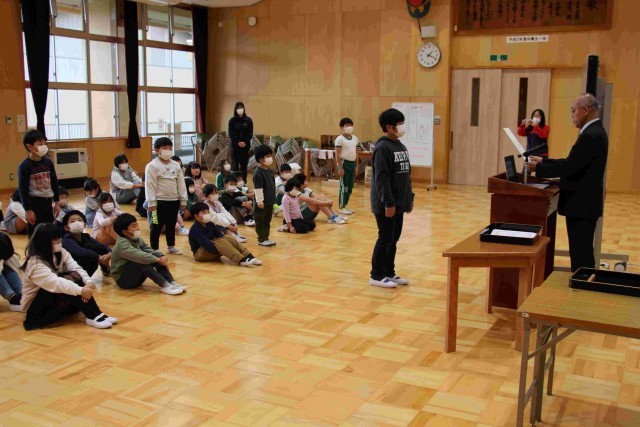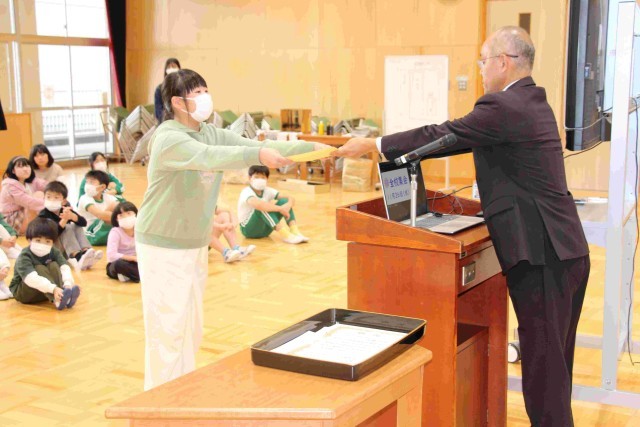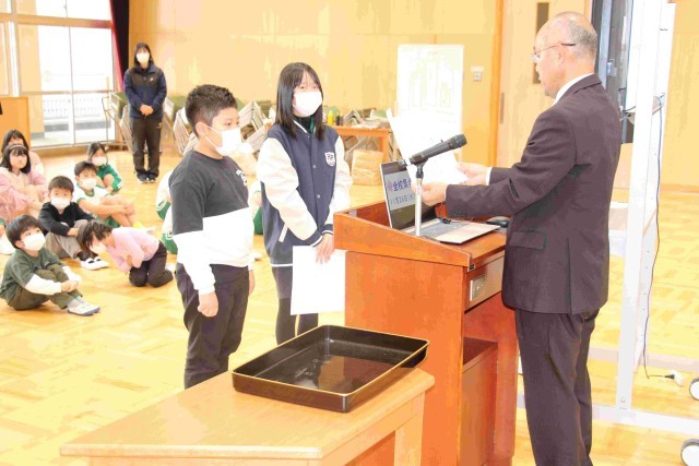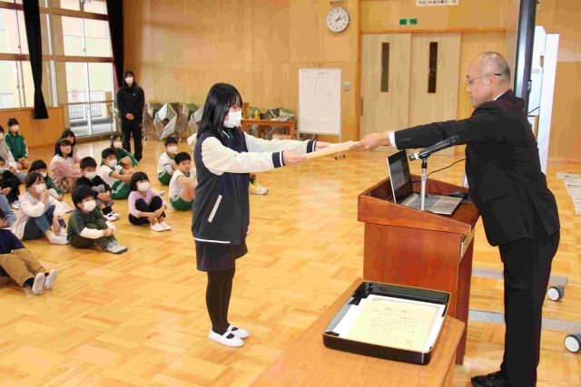 理科作品展や児童作文コンクール、子ども美術展、少年の主張コンクールの賞状を子どもたちに渡しました。
