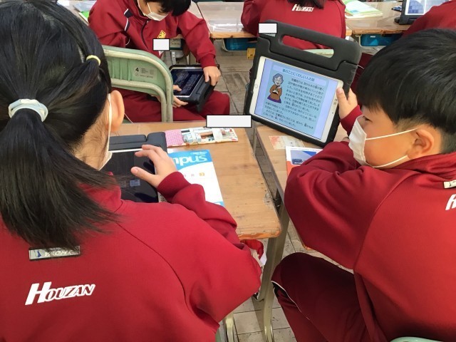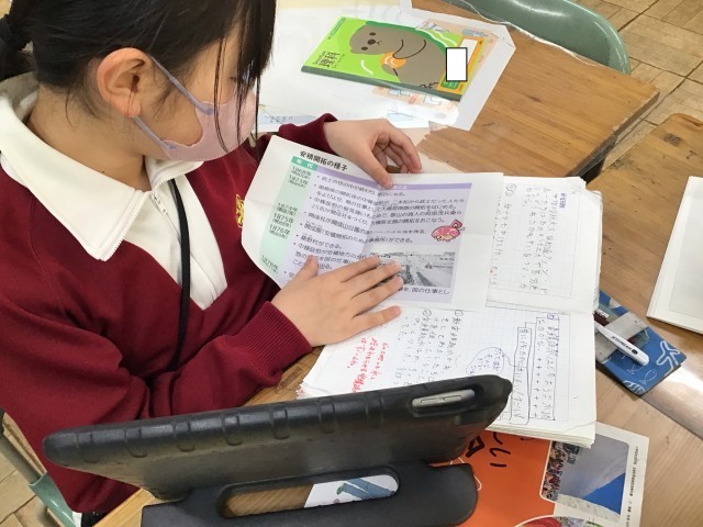 子どもたちは、今までに学習した資料やノートを振り返りながら書きました。