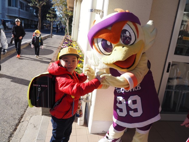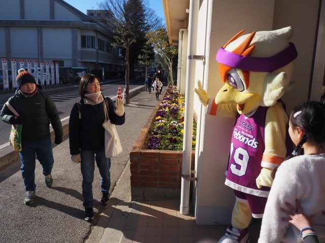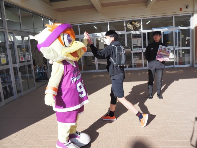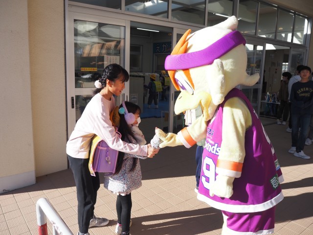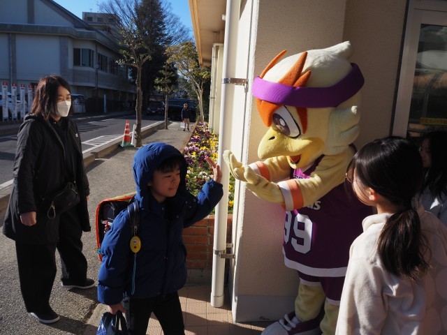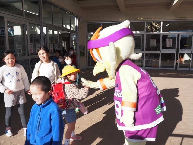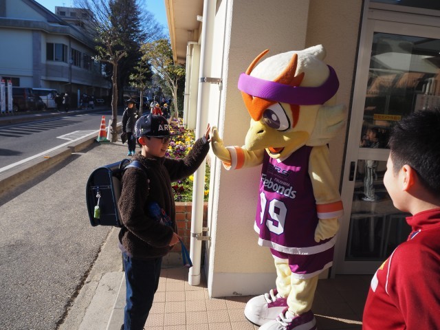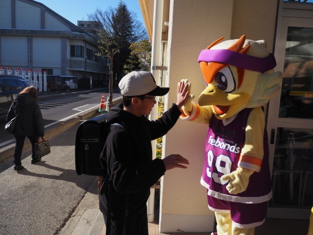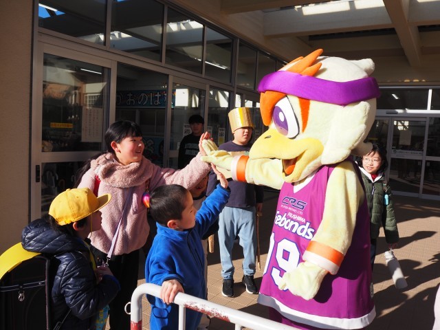 本日、福島ファイヤーボンズのマスコット、ボンズくんが、フロントスタッフ2名と一緒に登校してくれました。