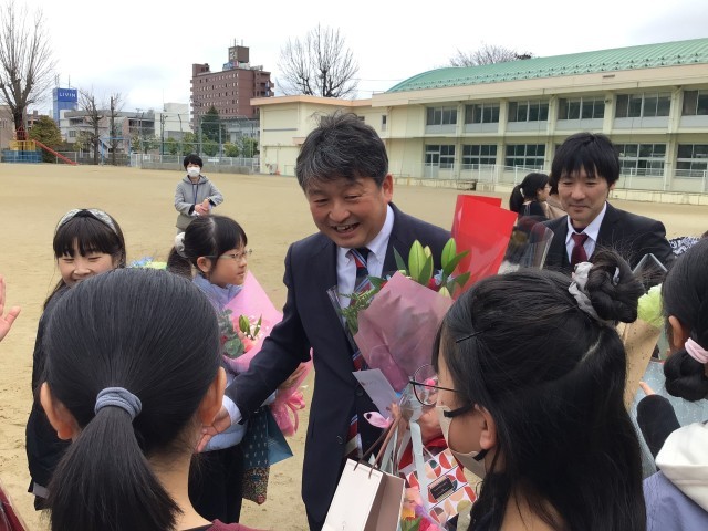 校庭に出て、花道を全校生で作り、先生方の門出を見送りました。