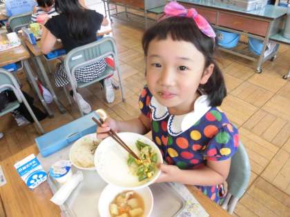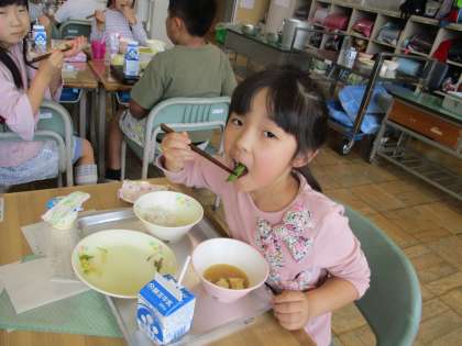 今日、6月12日の給食は、昨日お手伝いしたスナップエンドウが使われた,スナップエンドウのおかかあえです。子どもたちは,昨日から今日の給食を楽しみにしていました。