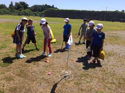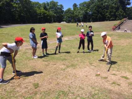 半分のグループは、最初はグランドゴルフを行いました。クラブがグループに二本なので、交代しながら慎重に打ちます。もうちょっと!少し右に傾いている?入ったー!