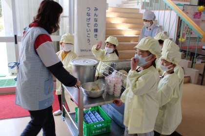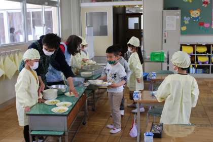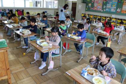1年2組の給食の様子です。みんな美味しそうに食べています。コロナ対策で残念ながら、全員前向きで、お話はしないで食べています。