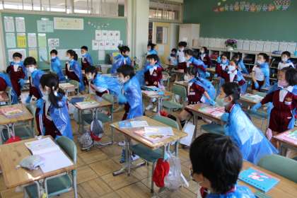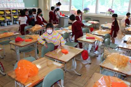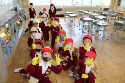 1・2年生は、マントと手袋をつけ、いざ運動会練習へ出発です。
