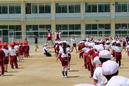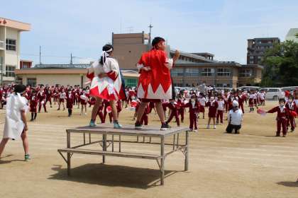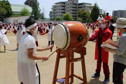 運動会全体練習、応援練習の様子です。応援団長、気合入っています。