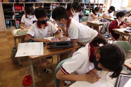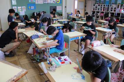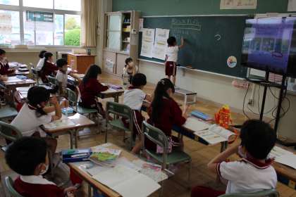 5年2組は算数です。考えを共有し合っています。4年1組は図工です。絵に挑戦中です。1年2組は算数です。黒板で考えを発表しています。それをみんなで聴いています。
