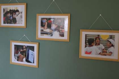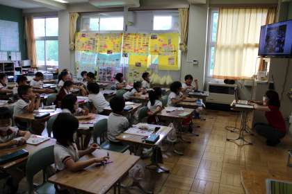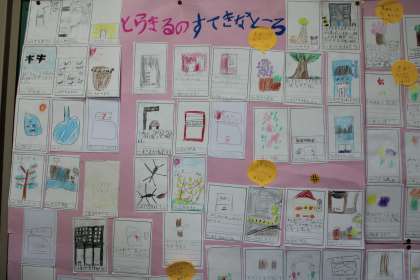 2年2組は生活科の町探検の様子を振り返っています。子どもたちの思いがこめられた掲示物です。校内の写真変わりました。授業中のいい表情です。