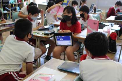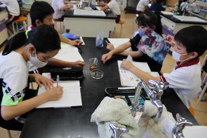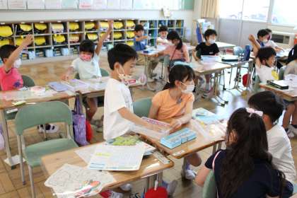 5年2組は国語の様子です。俳句の学習です。5年1組は理科です。ごはんにヨウ素液をかけ変化の観察です。1年2組は算数です。引いたトランプのカード2枚の合計を出しています。