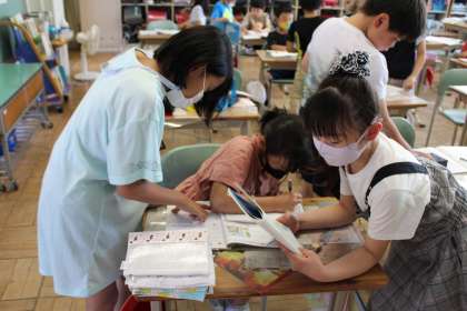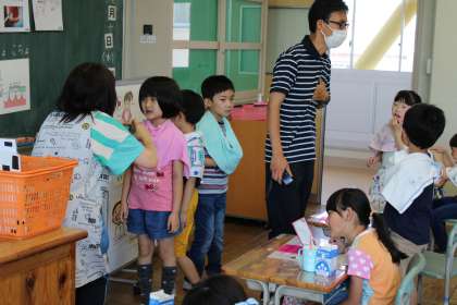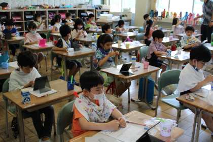 2年1組は養護教諭による歯みがき指導です。昨年より上手に磨けているでしょうか。3年1組はタブレットを使って社会科の学習です。