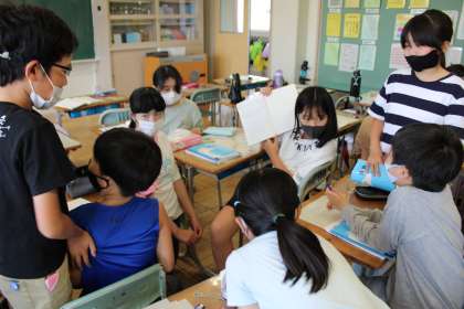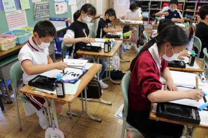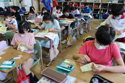 6年2組は習字です。「きずな」を書いています。5年2組は算数です。グループで考えを深め合っています。5年1組は家庭科で、裁縫の基礎を学んでいます。玉止め、難しいんですよね。