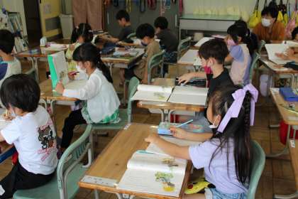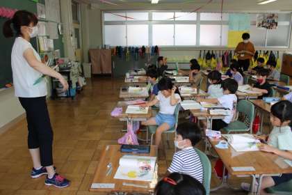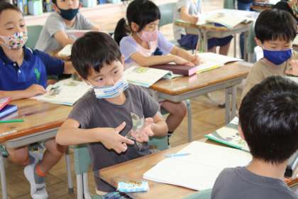 1年1組は国語です。おおきなかぶの学習です。福島大学の宗形潤子先生にもお出で頂き、授業の様子を見て頂いています。身振り手振りで一生懸命に自分の考えを伝えようとする姿いいですね。