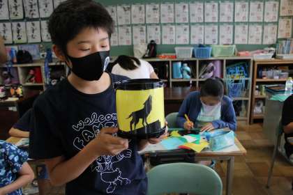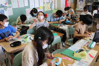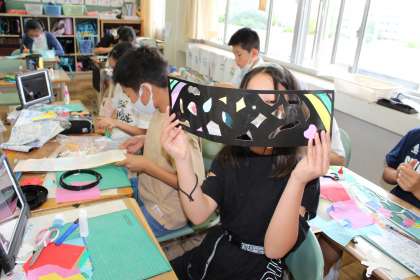 6年1組は図工です。ステンドグラスっぽい作品に挑戦中です。細かい作業をこなし写真のような作品になります。ん〜3枚目の写真、どこか変?