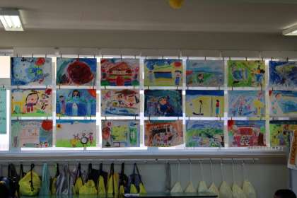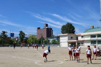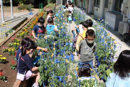 5年2組はスポーツテストでソフトボール投げに挑戦です。2年2組は育てている野菜の観察です。1年2組は教室の掲示してある絵です。