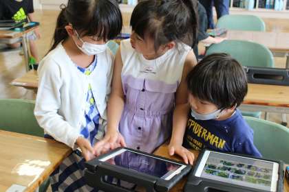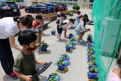 1年1組はタブレットを使ってアサガオの写真を撮り、ロイロノートを使って先生に写真を送信して提出しています。それをみんなで見ることができます。1年生もタブレット使っています。