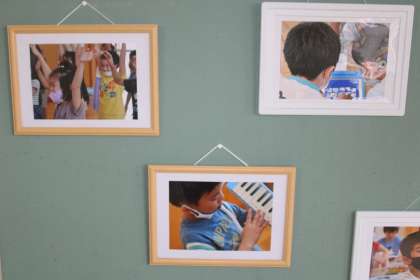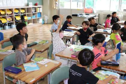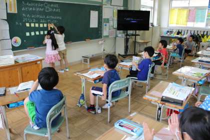 校内の掲示物、子どもたちの素晴らしい表情です。1年1組は算数です。よく話を聴いています。1年2組も算数です。黒板で操作しながら説明です。