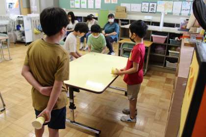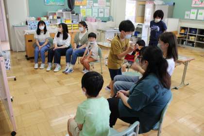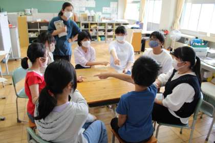 すみたん学級に郡山女子短大生が授業の一環で来校しています。一緒にゲームにも参加して子どもたちと交流しています。
