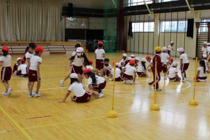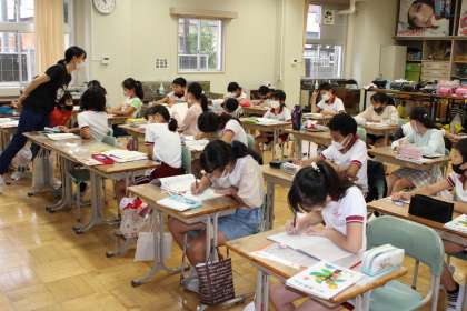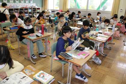 1年生は体育館で川跳びを取り入れた場づくりでリレーです。4年2組は算数です。4年1組は静かに読書中です。