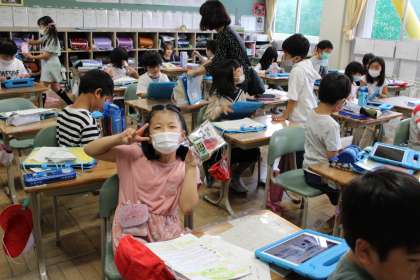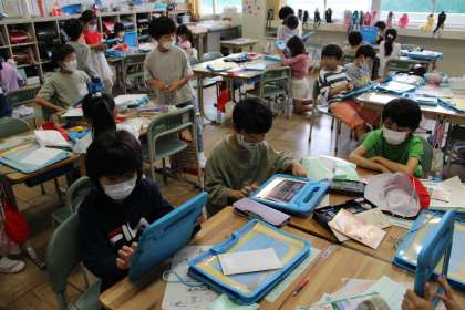 2年生町探検でお世話になったお店等でいただいたもの大事そうに見せ合っています。タブレットの動画や写真を見せ合っています。お手伝いいただいた保護者の皆様、ご協力いただきました地域の商店、交番、施設の皆様ありがとうございました。
