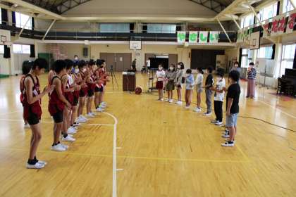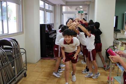 陸上選手代表のお礼のあいさつ、終了後には、選手の皆さんが応援団の皆さんにお礼の言葉を述べています。ここがいいですね。更には教室に戻る途中、図工室にいる4年2組のメンバーがアーチを作り、その中を通っています。これもいいですね。これぞ芳山小学校です。