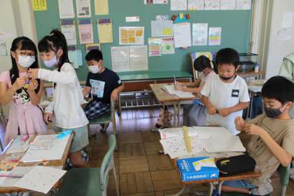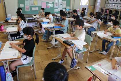 3年1組廊下の様子です。秋を感じます。3年1組は算数の様子です。3年2組は国語の様子です。