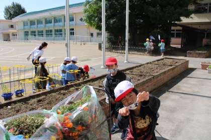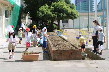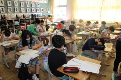 4年2組は自分の教室に戻り、算数の学習です。1年は何秒?とコンパスで指定の模様書きに挑戦中です。1年2組は絶好の天気のもと、外で虫取りです。カマキリや蝶を捕まえています。学校にもいろいろな虫がいるものです。