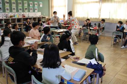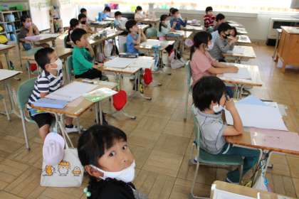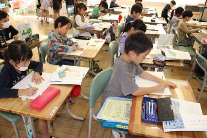 1年1組と2組は国語の様子です。4年1組はAETクロイ先生と青木先生と英語活動の学習です。