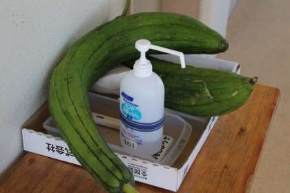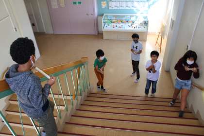 4年1組廊下においてあるヘチマです。立派に育ちました。1年生かおフェスの練習中です。4年2組は理科で空気鉄砲の実験です。