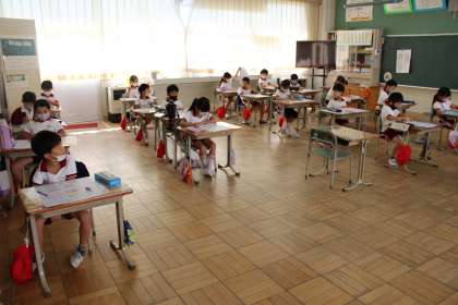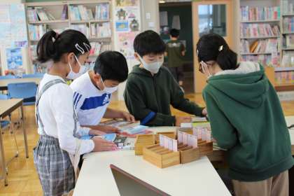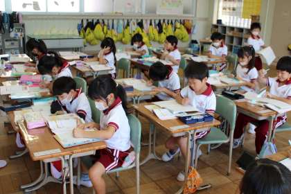 5年1組は図書室で本の返却と新たに借りています。1年1組は国語の様子です。1年2組はテストの最中です。
