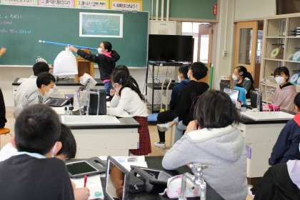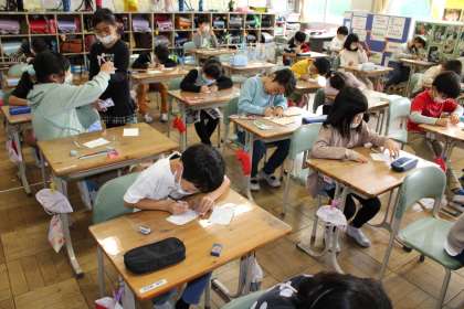 2年2組は生活科で、町探検のお礼の手紙を書いています。6年1組は理科で、てこの働きの学習です。
