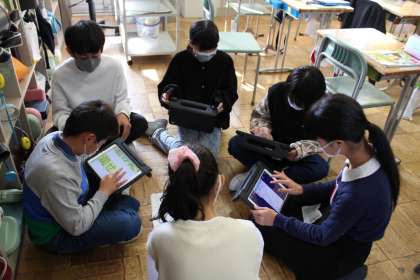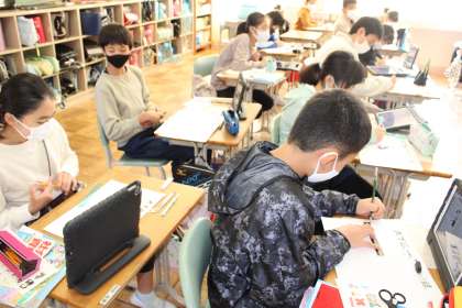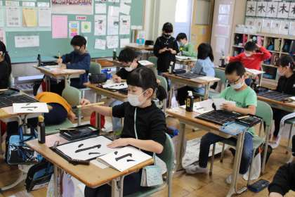 6年生は、グループに分かれて、かおフェスの準備中です。3年2組は習字です。