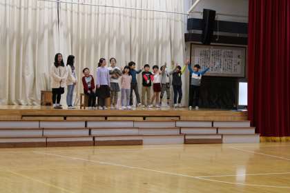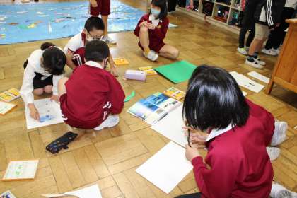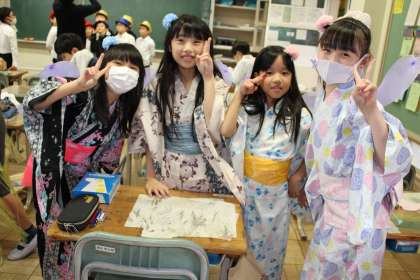 3年生は、かおフェスの準備中です。衣装合わせ?かわいい乙姫たち、背景づくりをがんばるグループと様々です。4年生は、かおフェスの練習中です。
