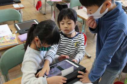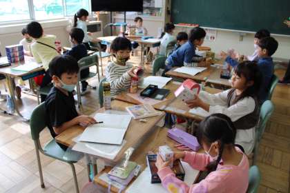1年1組はタブレットログイン中です。1年1組は算数ですいろいろな入れ物を使って形の関心を高めています。1年2組は国語くじらぐもの学習です。