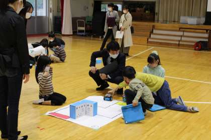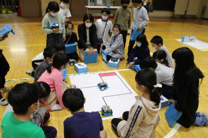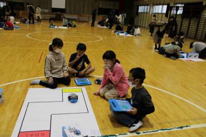 3年生は体育館でプログラミング学習です。試行錯誤しながら課題解決に向けて二人組で取り組んでいます。