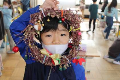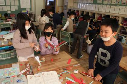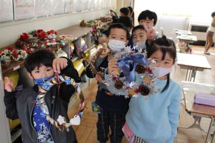 1年2組は昨日の授業参観で親子で作ったリースを見せてくれました。2年1組は国語です。教科書に沿って馬を作っています。