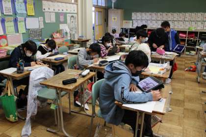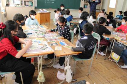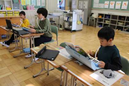 6年2組は図工です。板を切り抜いてという題材で、下絵を描いています。すみれ学級は鍵盤ハーモニカに挑戦中です。5年2組は図工で、絵のカードを使ってストーリーを作っています。