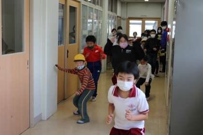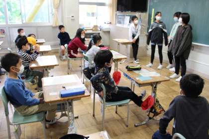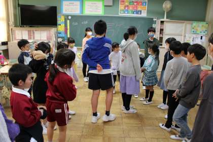 まずは6年生の話を聴いています。だるまさんが転んだ、伝言ゲームの様子です。