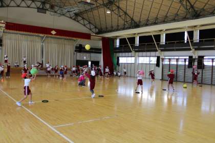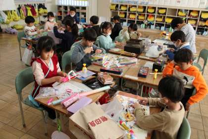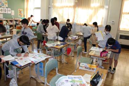 2年生は体育館でリレーです。ボール上手にキャッチできたかな。1年1組は図工の様子です。いろいろな材料を持ち寄り創造を働かせています。3年2組は社会の様子です。互いに考えを交流し合っています。