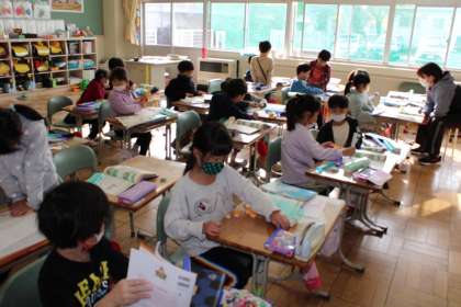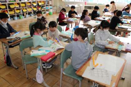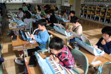 1年1組は算数の様子です。音楽では鍵盤ハーモニカに挑戦です。