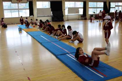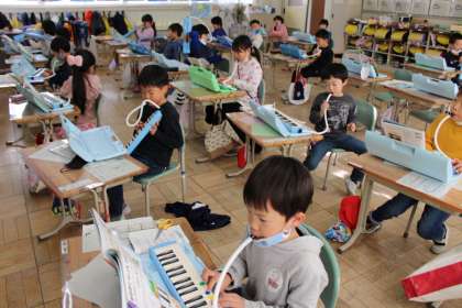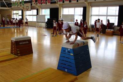 1年2組は音楽で鍵盤ハーモニカに挑戦です。3年生は体育で跳び箱とマット運動に挑戦です。