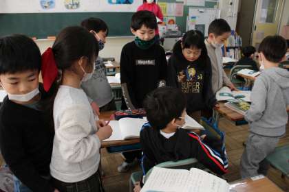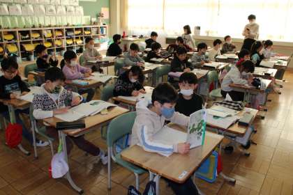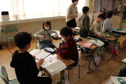 1年1組は国語です。たぬきの糸車、友達と考えを伝えあい、聴きあっています。