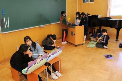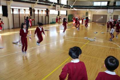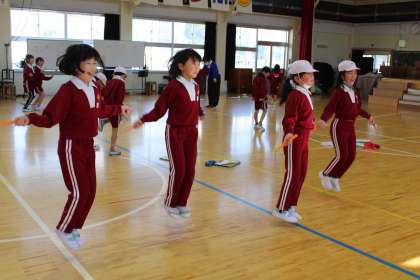 5年1組は音楽です。各々の楽器に挑戦です。3年生体育でいろいろな跳び方に挑戦です。二人組で頑張っています。