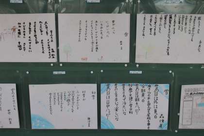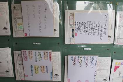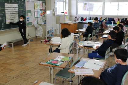 1年2組は算数です。前に出て自分の考えを発表しています。5年2組と4年2組廊下の掲示です。