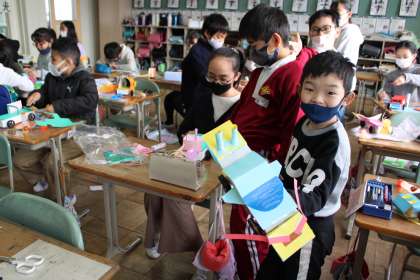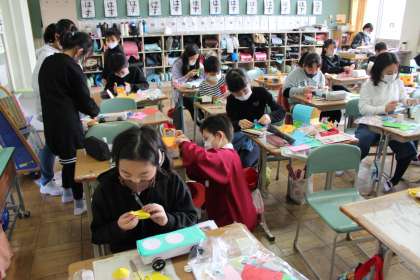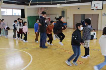 4年2組は図工です。走る車にデザインしています。4年1組は長縄跳びに挑戦中です。秘密特訓かな?