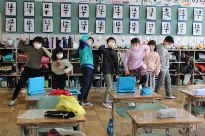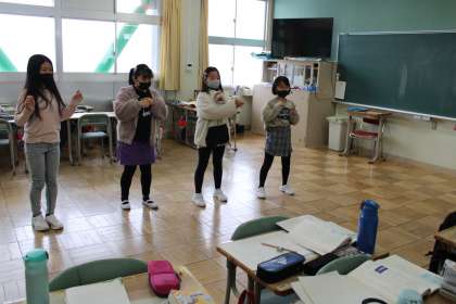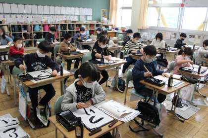 3年2組は習字で「つり」と書いています。4年1組は体育でダンスに熱中しています。自分たちで課題を見つけ、話し合ってより良いものを目指しています。